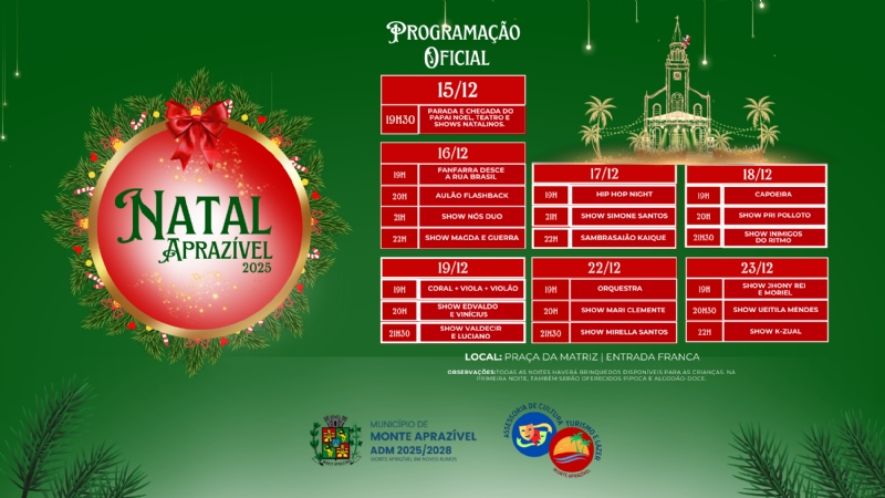 A Prefeitura Municipal de Monte Aprazível divulga a programação oficial do Natal Aprazível 2025, que acontecerá entre os dias 15 e 23 de dezembro, na Praça da Matriz, com entrada gratuita.