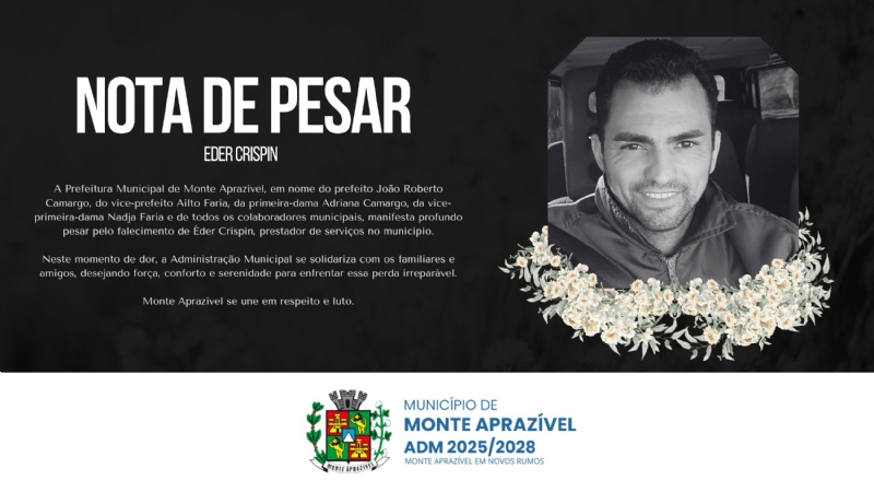 Na data de ontem, a Prefeitura Municipal de Monte Aprazível prestou sua homenagem e expressou profundo pesar pelo falecimento de Éder Crispin, manifestando solidariedade aos familiares e amigos neste momento de dor. Que encontrem conforto e força para atravessar este período difícil.